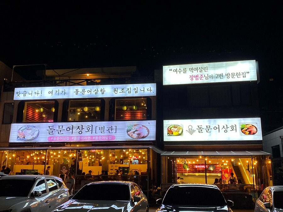 여수 낭만포차 거리에서 하멜등대 쪽으로 가면 실내 포차거리가 있습니다. 돌문어 삼합을 처음으로 개발한 돌문어상회를 방문했습니다. 매장 바로 앞에 주차장이 있어 편리합니다.
