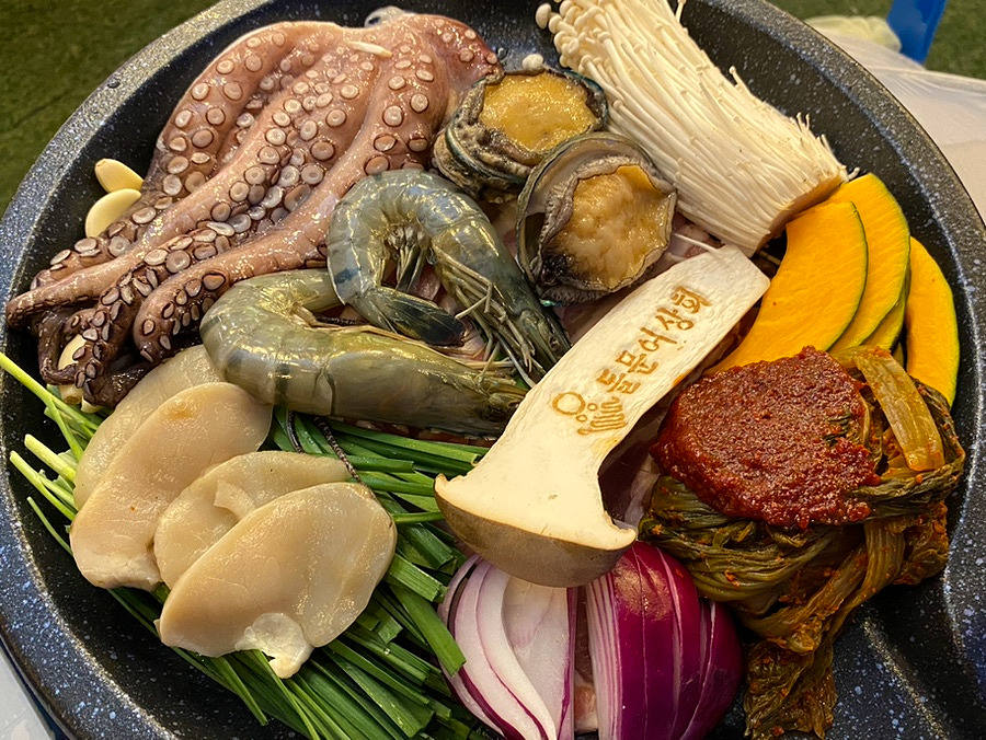 구성은 돌문어, 삼겹살, 갓김치, 관자, 새우, 전복, 버섯, 야채로 매우 푸짐합니다.