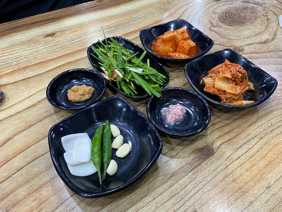 주문 후 기본 반찬으로 국내산 김치와 단무지가 제공됩니다. 깍두기의 익힘 정도가 완벽하여 식사 전부터 만족스러운 맛을 선사합니다. 추가 반찬은 셀프바에서 자유롭게 가져갈 수 있습니다.