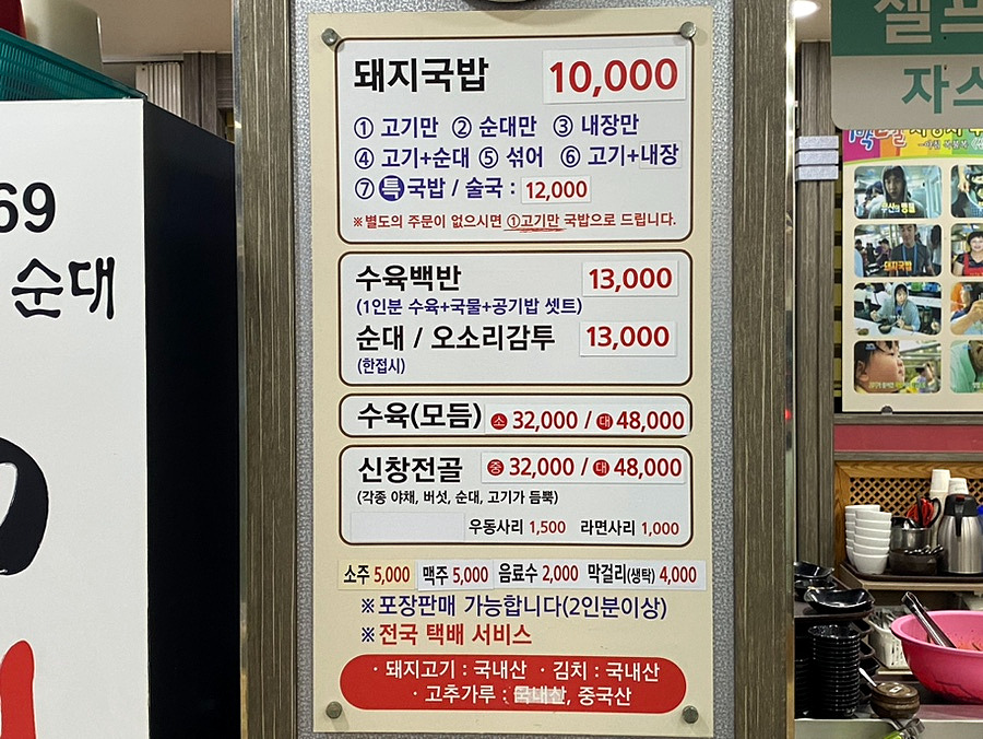 신창국밥의 메뉴는 돼지국밥 종류가 다양하게 제공됩니다. 메뉴 구성은 고기만, 순대, 섞어 등이 있으며 가격은 동일합니다. 그 외에도 수육 백반, 순대, 신창전골 등이 준비되어 있습니다. 저는 돼지국밥을 좋아하여 섞어국밥 특 사이즈를 주문하였습니다. 메뉴판을 보면 간단하지만 푸짐한 구성으로 누구나 부담 없이 즐길 수 있도록 되어 있습니다.