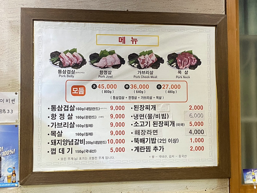 메뉴판을 보면 마포통연탄구이가 감천에서 인기가 많은 이유가 극강의 가성비 때문임을 알 수 있습니다. 모듬 대 기준 45,000원에 800g의 고기가 제공되며, 가격 대비 양이 많아 많은 손님들이 찾습니다. 저는 3명이 방문하여 모듬 중과 뚝배기밥, 소고기 된장찌개를 주문하였습니다.